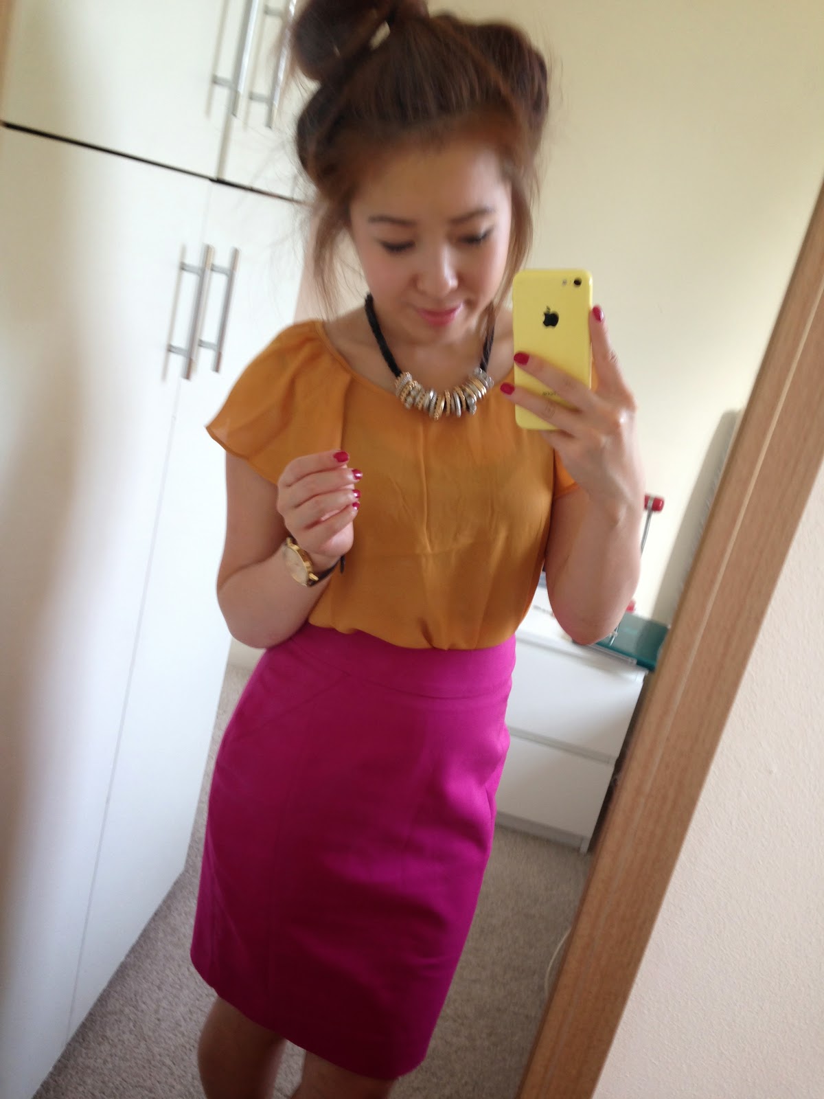 Next: Yellow chiffon top from F21 and hot pink skirt from H&M